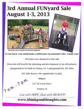 Here is information about the fundraiser Brenda and her family are working on to raise money for the playground.  If you are in the Grimes area the first weekend in August, please stop by!